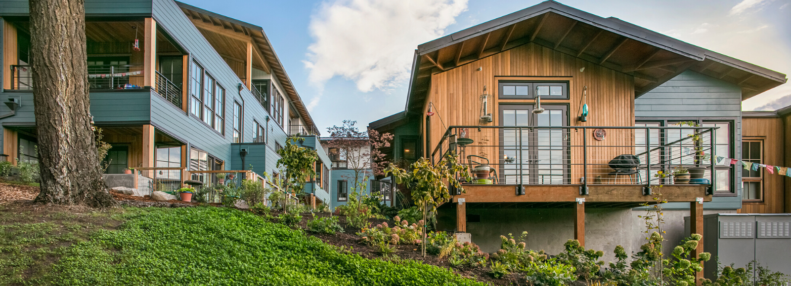 Homes nestled next to our lush two-acre community garden just above the Willamette River.